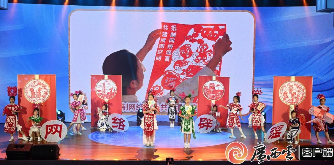第三篇章,通过快板《网络谣言不可信》、剪纸时装秀《清谣剪影》以及发出《聚辟谣之力 扬文明之光》倡议等方式,传递清朗八桂、共筑同心,网络辟谣一直在路上的理念。
