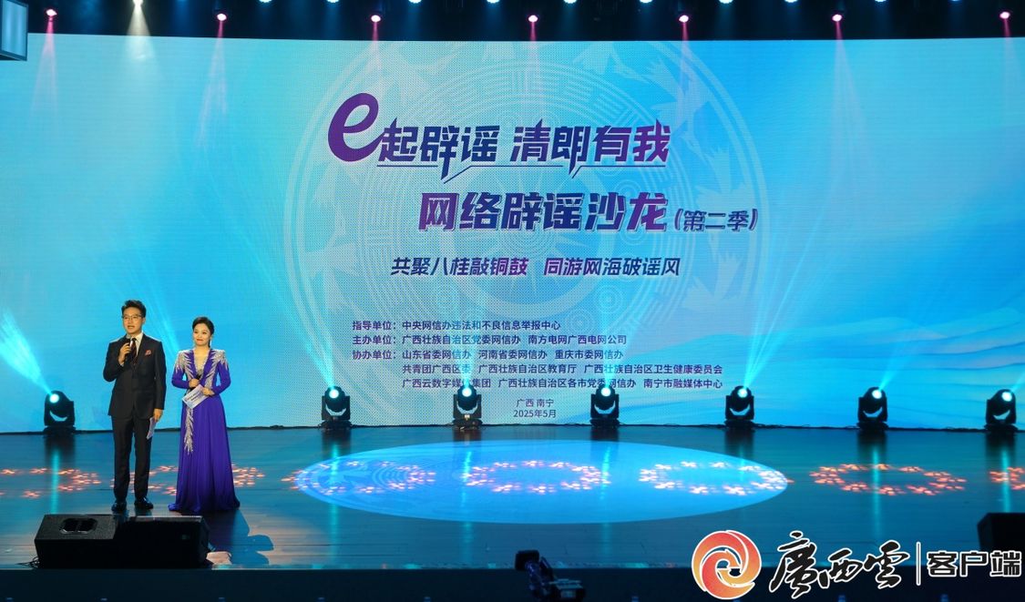 2025年5月15日,由广西壮族自治区党委网信办、南方电网广西电网公司联合主办的“e起辟谣 清朗有我”网络辟谣沙龙(第二季)在广西南宁举办。本季辟谣沙龙以“共聚八桂敲铜鼓 同游网海破谣风”为主题,分为“识谣·智启八桂、治谣·众志成城、止谣·清朗永续”3个篇章,以主旨分享+主题晚会的方式,生动展现广西在建立辟谣联动机制、跨区域协同治理的前沿思考与创新实践,通过多元载体融合、全链条协同联动,打造兼具传播力与引导力的辟谣矩阵,形成共建共治共享的网络治理新格局。