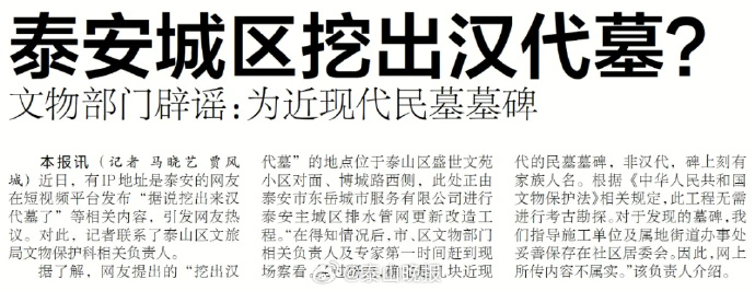 据了解,网友提出的“挖出汉代墓”的地点位于泰山区盛世文苑小区对面、博城路西侧,此处正由泰安市东岳城市服务有限公司进行泰安主城区排水管网更新改造工程。“在得知情况后,市、区文物部门相关负责人及专家第一时间赶到现场察看。经过研究,确定是几块近现代的民墓墓碑,非汉代,碑上刻有家族人名。根据《中华人民共和国文物保护法》相关规定,此工程无需进行考古勘探。对于发现的墓碑,我们指导施工单位及属地街道办事处妥善保存在社区居委会。因此,网上所传内容不属实。”该负责人介绍。